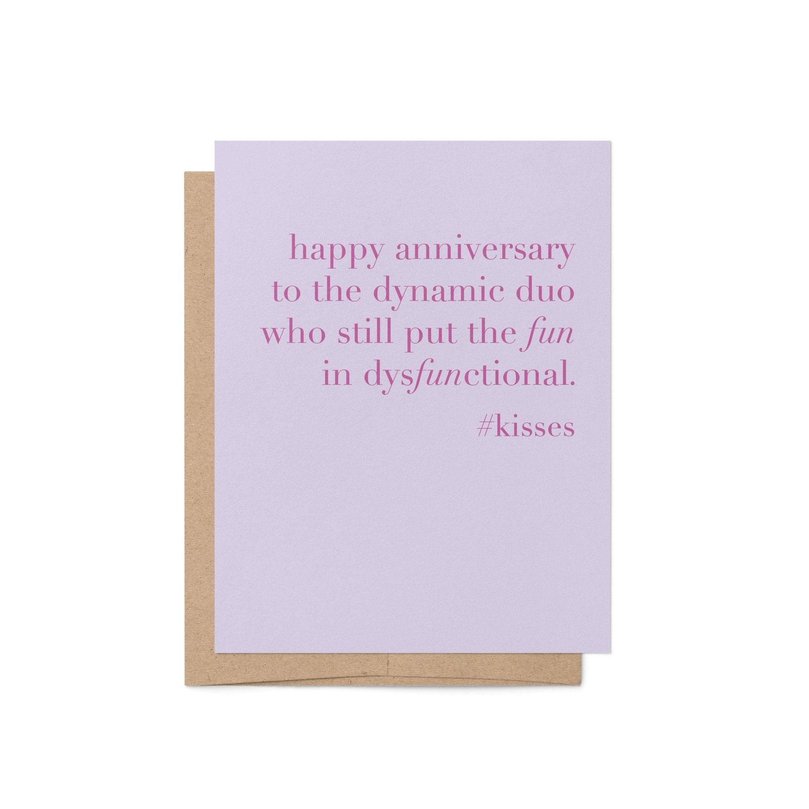 Card reads “Happy anniversary to the dynamic duo who still put the fun in dysfunctional. #kisses”