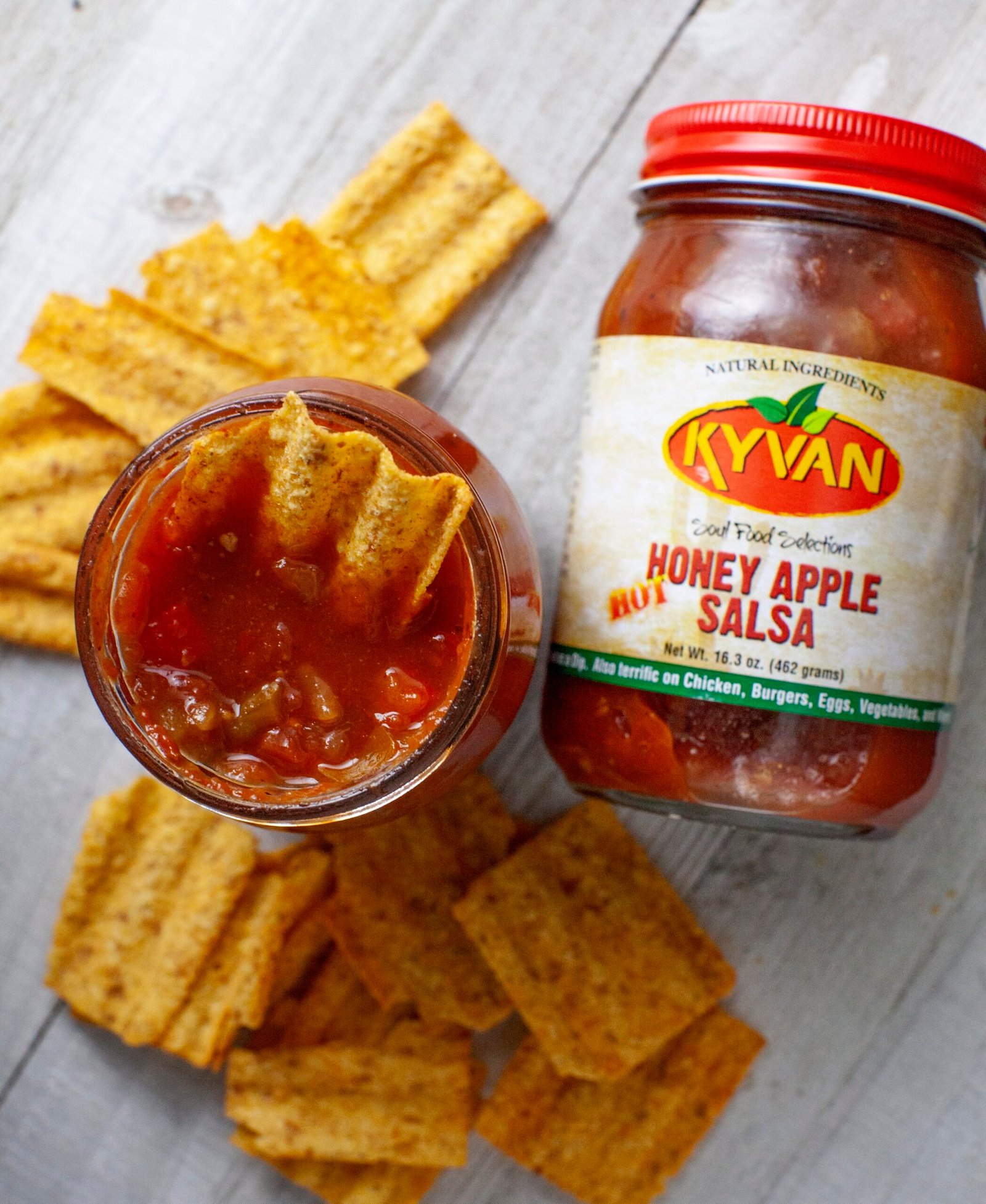 Mild Honey Apple Salsa:Â This slowly simmered, premium salsa featuring fresh robust tomatoes and peppers is a sure way to excite your tastebuds. With a touch of honey combined with an array of spices, KYVAN salsa is a great compliment to any dish. Unlike typical salsas that we commonly see, it has a refreshing southern taste mixed with apples and fresh vegetables. One taste and the possibilities become unlimited.