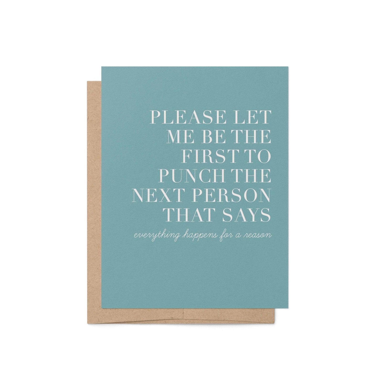 Card reads “Please let me be the first to punch the next person that says everything happens for a reason”