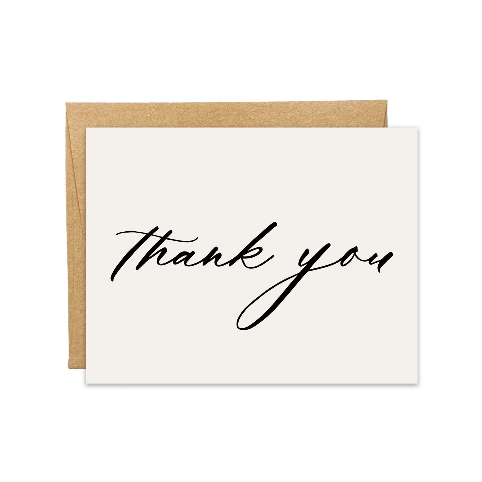 Express your gratitude with an elegant thank-you card. Featuring an eye-catching cream background and chic black script, this card will make any recipient feel special. Hand-write your own personal message inside + show that special someone how much you appreciate them.