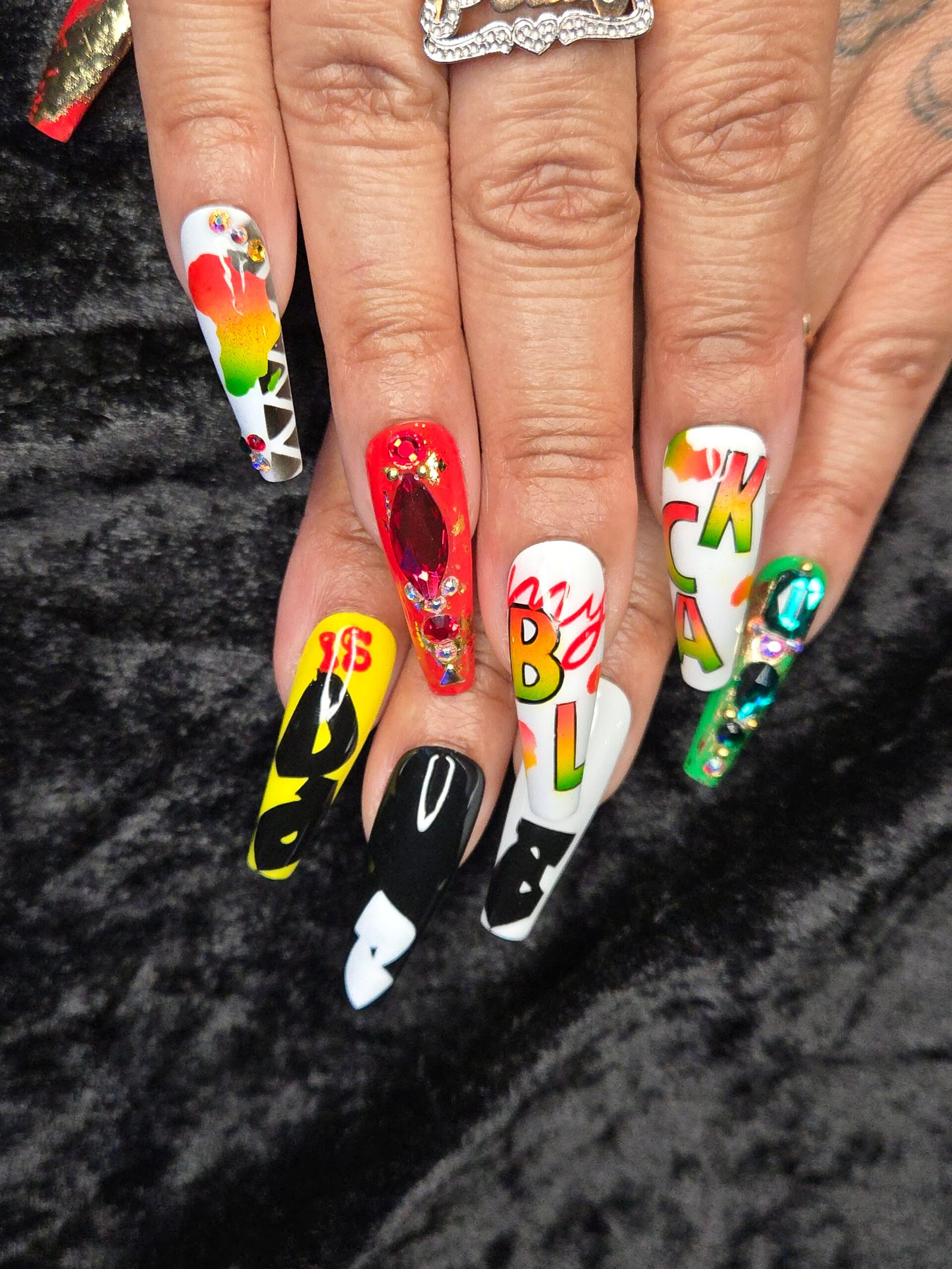 Elevate your nail game with my Unapologetically Dope press-on set. This set features real crystals and unique, hand-painted and airbrushed designs in beautiful, vibrant colors.
