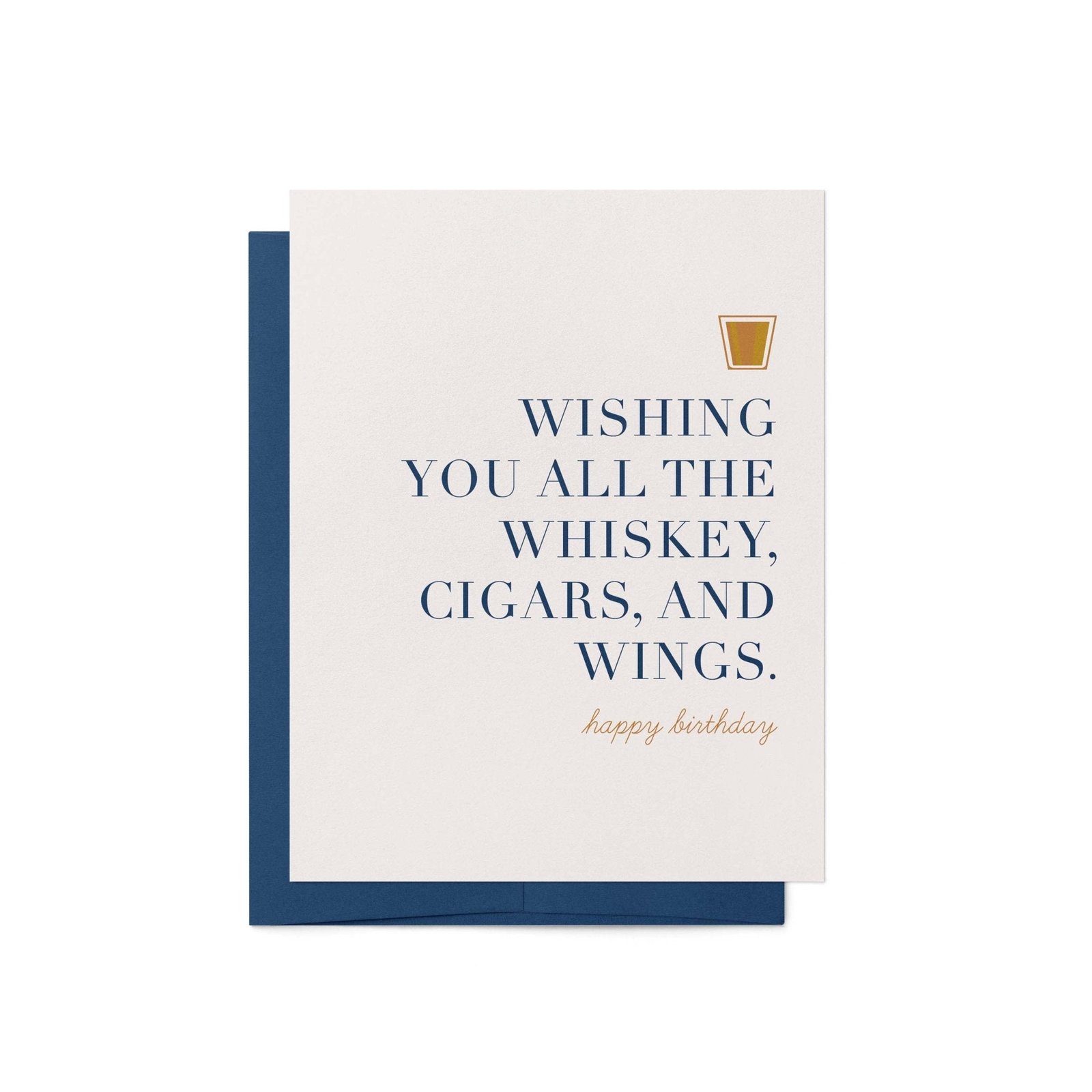 Card reads “Wishing you all the whiskey, cigars, and wings. happy birthday”